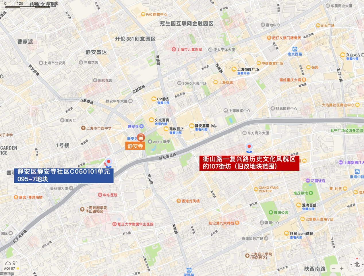 最后一宗地,衡山路—复兴路历史文化风貌区的107街坊(旧改地块范围),该地块地处衡复风貌区的巨富长区域,由两幅地块组合而成,是大名鼎鼎的巨鹿路零星旧城区改建项目。